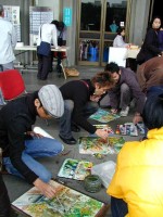 也有同學是結伴而來的,當天坐在國父紀念館西門口作畫的一群人,就是復興商工美工科三年級的學生們,人數眾多加上打扮入時的他們,頓時吸引了在旁的觀眾圍觀,看看這群看來相當有藝術氣質的學生們究竟在畫什麼,「我們是老師帶我們全班來的啦,為什麼要坐這畫哦?因為下雨啊!又離服務台近。」阿胖同學高興地說著。